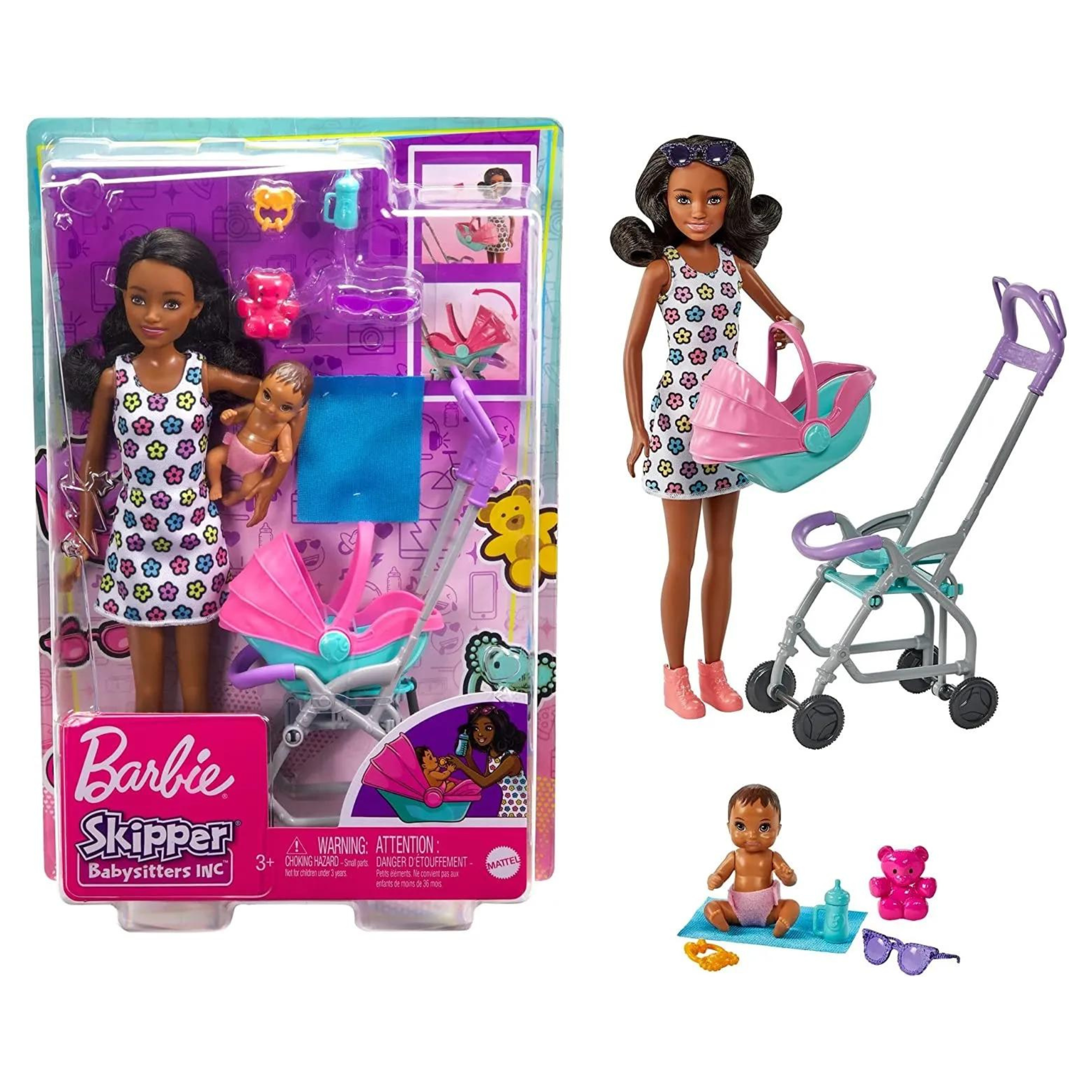 Barbie Skipper Babysitters permitem que a imaginação explore seu lado carinhoso como babá! Com este carrinho de criança de balanço da Barbie Skipper, as crianças podem ajudar a boneca Skipper a cuidar de uma boneca em um adorável carrinho que salta para cima e para baixo enquanto é empurrado. Com acessórios, incluindo um ursinho de pelúcia, mamadeira, chocalho e cobertor de bebê, a boneca Skipper tem tudo o que ela precisa para um dia bem-sucedido de babá!