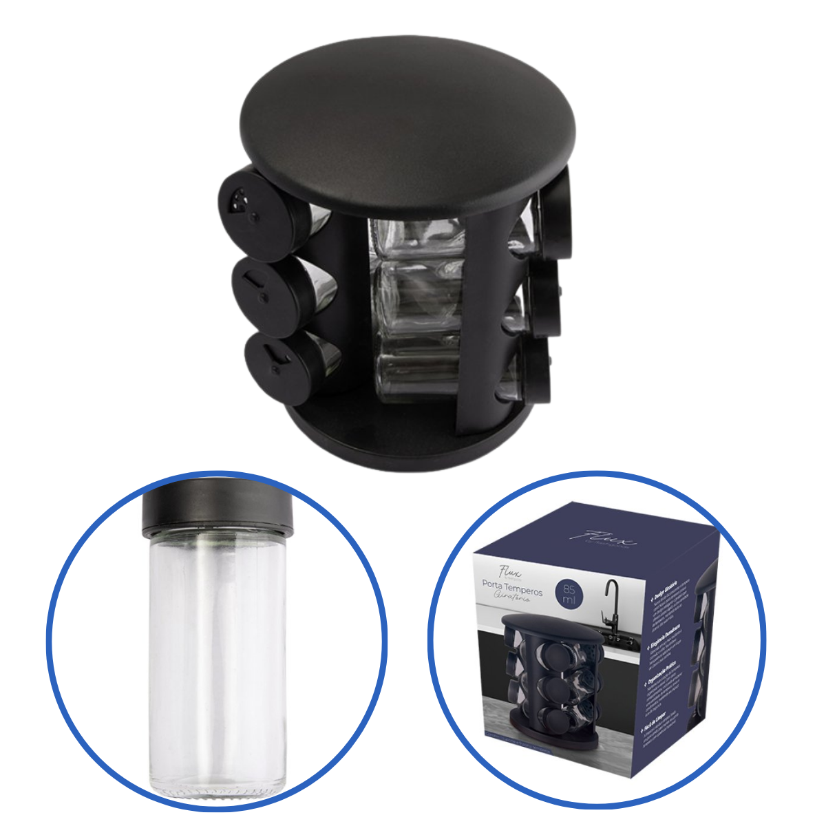O KIT 9 PORTA TEMPERO ROTATÓRIO é a solução perfeita para manter seus condimentos favoritos sempre à mão e bem organizados. Composto por 9 potes individuais de 85 ml, fabricados em vidro resistente e tampas de plástico durável, este conjunto garante a conservação e o fácil acesso aos seus temperos. A base giratória, com um elegante acabamento em preto, permite visualizar e alcançar cada pote sem esforço, otimizando o espaço da sua bancada ou armário. Ideal para quem busca praticidade, eficiência e um toque de modernidade na cozinha.