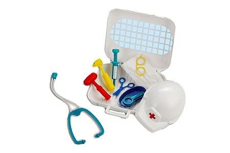 Contém na embalagem: 1 capacete, 1 bandejinha, 1 tesourinha, 1 óculos, 1 lupinha, 1 estetocopiozinho, 1 seringuinha, 1 auscultadorzinho, 1 martelinho e 1 mascarazinha crirúrgica.